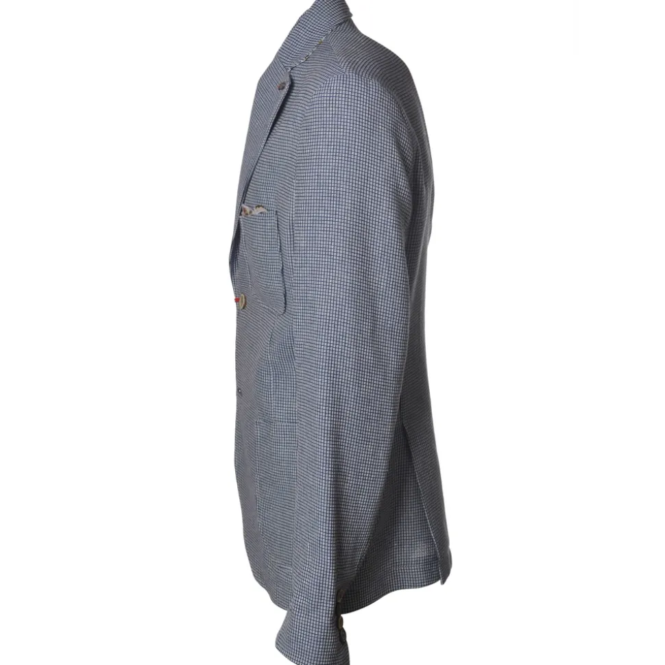 BoB jacket, fitted model with two buttons, strapless, double vent on the back, in checkered micro-pattern, two patch pockets.