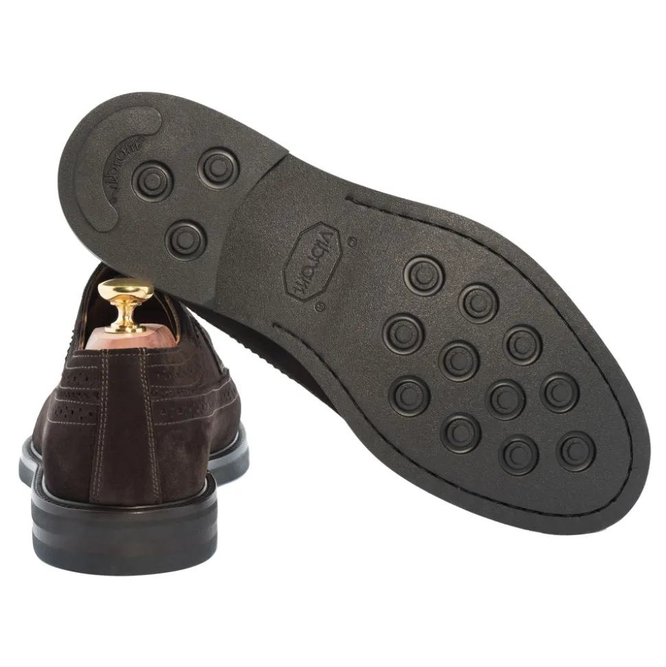Dark brown and with a comfortable and strong Italian Vibram rubber sole. It has a suede calf leather that makes it unique. It is a derby with a dovetail decoration on the upper, making it super stylish even with a pair of classic trousers or jeans. Highly versatile and the perfect match for any kind of style you want to wear.