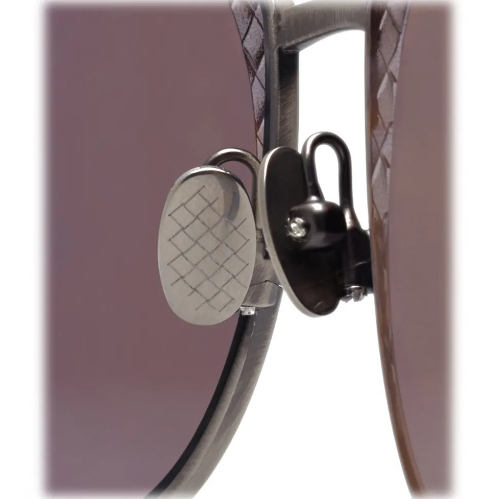 These modern cat-eye sunglasses are made of refined metal, lightweight but robust. The timeless model features hand-decorated lenses with iconic intertwined details, exclusive Bottega Veneta hemispherical rivets and personalized plaques for comfortable use.