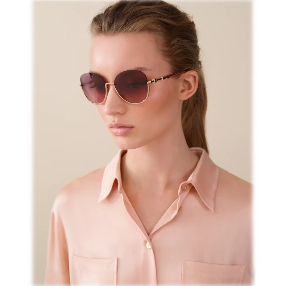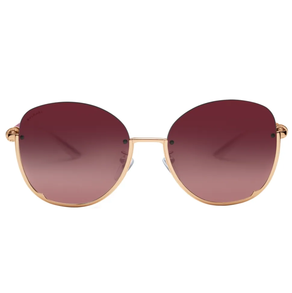 Bvlgari B.zero1 sunglasses with semicircle frame in rose gold colored metal, shaded violet lenses and temples with decoration inspired by the jewels of the B.zero1 collection.