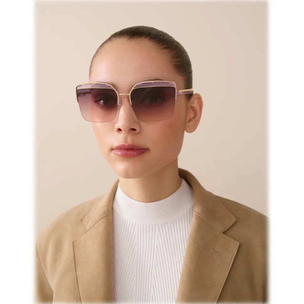 Bvlgari B.zero1 sunglasses “B.overvibe” with pink gold square semi-circle frame, temples and front with striped metal decoration inspired by the architectural geometries of B.zero1 and pink mirror lenses. A model with a distinctive design that revisits the iconic spiral motif enhancing the boldness of the B.zero1 style.