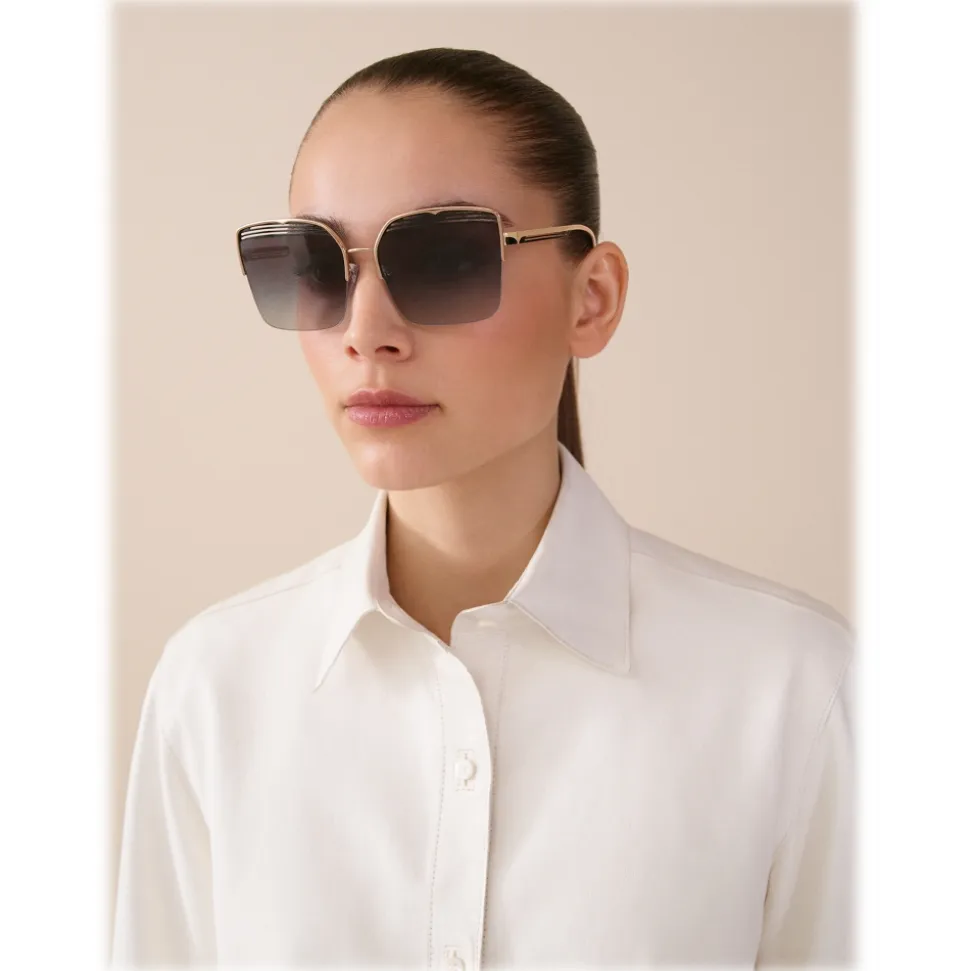 Bvlgari B.zero1 sunglasses “B.overvibe” with pink gold square semi-circle frame, temples and front with striped metal decoration inspired by the architectural geometries of B.zero1 and gray gradient lenses. A model with a distinctive design that revisits the iconic spiral motif enhancing the boldness of the B.zero1 style.