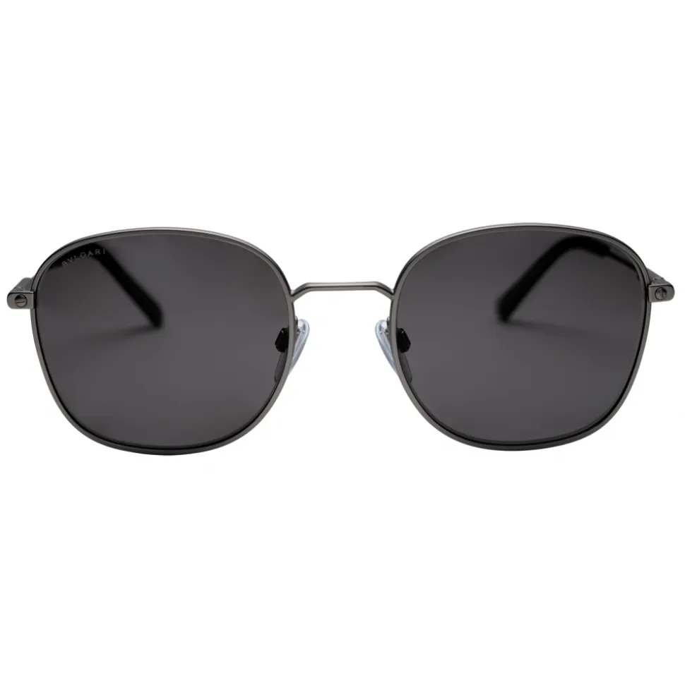 Diagono round metal sunglasses with grey polarised lenses. The distinctive tubular hinge with Bvlgari logo in matte gunmetal characterises the flexible, slender metal temples. A must-have to complete a sporty-chic look.
