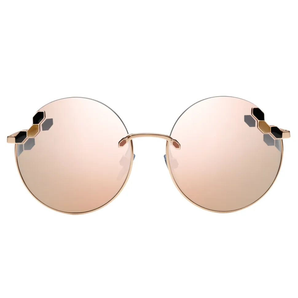 Serpenti Poisaround sunglasses with oversized rose gold frame and pink mirror round lenses. To animate the front, an eye-catching lasered decoration with snake scales in polychrome enamel.