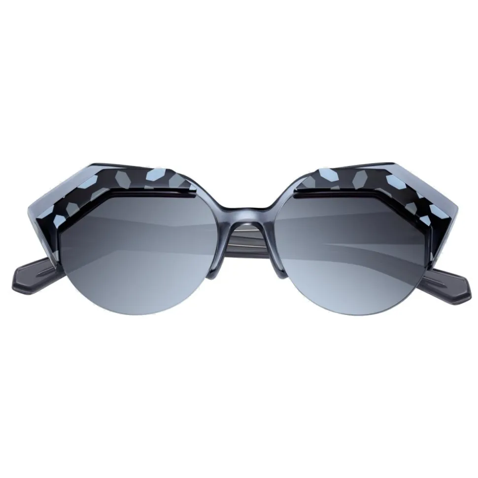 Bulgari “Serpenteyes Power-Up” sunglasses with cat-eye acetate frame and round lenses. Multilayer acetate frame. Double hexagonal profile with snake scales on round and flat lenses. Transparent temples with geometric pattern in metal and hexagonal terminals.