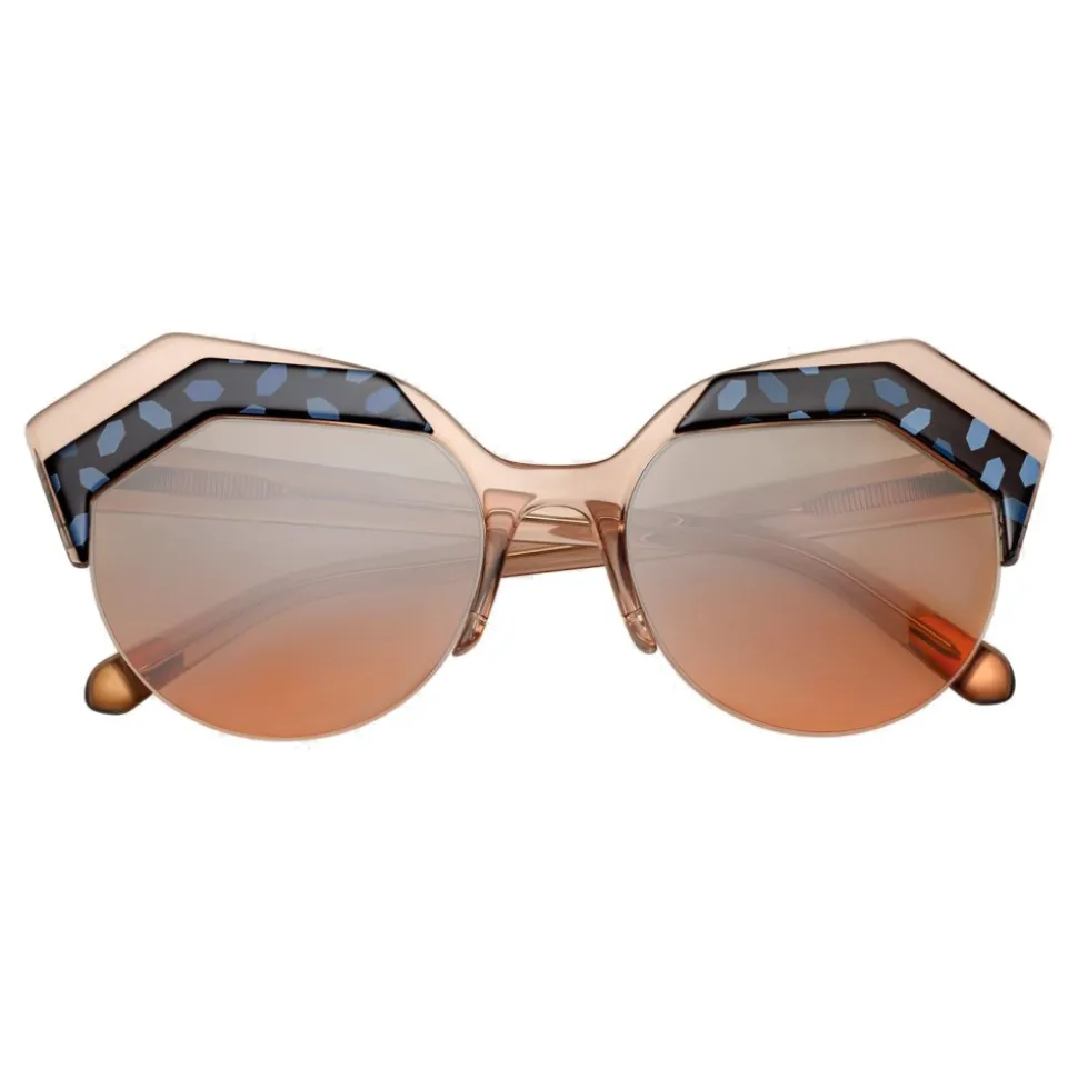 Bulgari “Serpenteyes Power-Up” sunglasses with cat-eye acetate frame and round lenses. Multilayer acetate frame. Double hexagonal profile with snake scales on round and flat lenses. Transparent temples with geometric pattern in metal and hexagonal terminals.