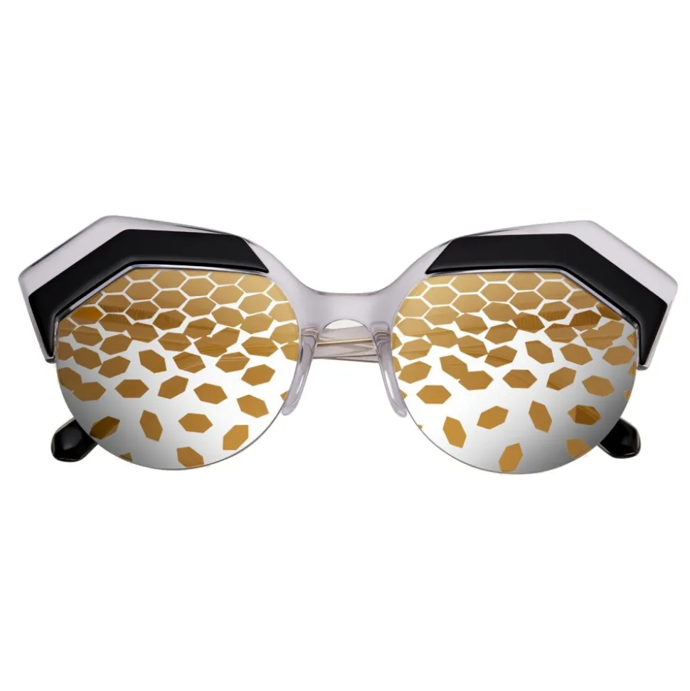 Bulgari “Serpenteyes Power-Up” sunglasses with cat-eye acetate frame and round lenses. Multilayer acetate frame. Double hexagonal profile with snake scales on round and flat lenses. Transparent temples with geometric pattern in metal and hexagonal terminals.