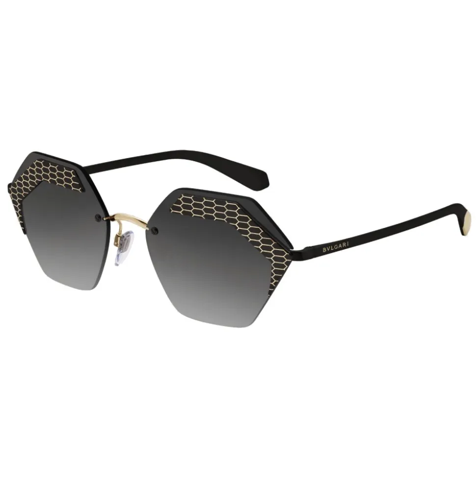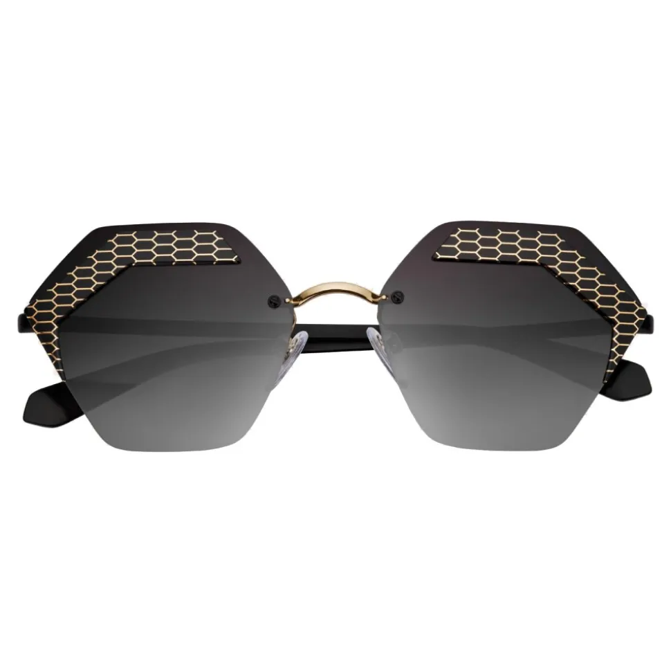 Bulgari “Serpenteyes X” sunglasses with hexagonal metal frame and hexagonal lenses. Hexagonal metal frame with eye-catching laser decoration inspired by snake scales and flat hexagonal lenses. The model is completed by thin metal temples with snakeskin-shaped terminals.