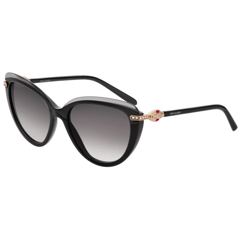 Bvlgari Serpenti cat-eye acetate frame with a transparent front browline exalting the volumes. A new interpretation of the iconic snake head adds a sparkling touch to the front piece while injecting comfort with flexible hinges.