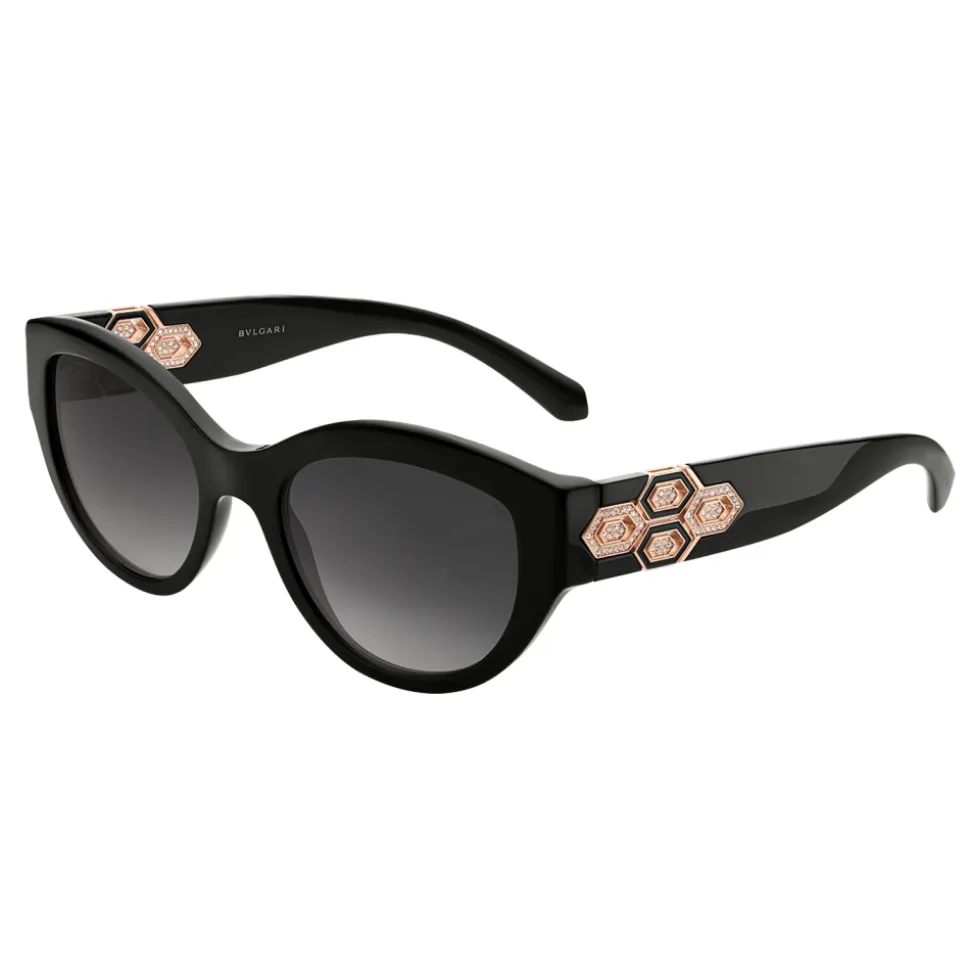Bvlgari Serpenti sunglasses with cat-eye frame in acetate and Serpenti pattern in metal with crystals.