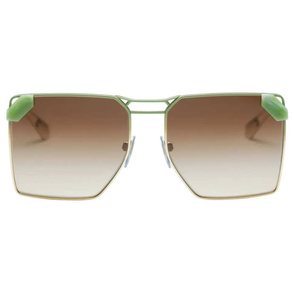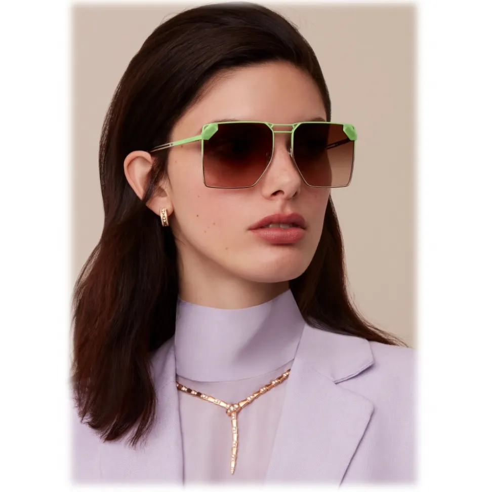 Serpenti “Sunnyscale” pale gold colour oversized square sunglasses with mint green mother-of-pearl effect snake scales overlapping brown gradient lenses. The slender temples with a mint green dégradé effect are characterised by openwork details that exalt the scale-shaped temple tips.