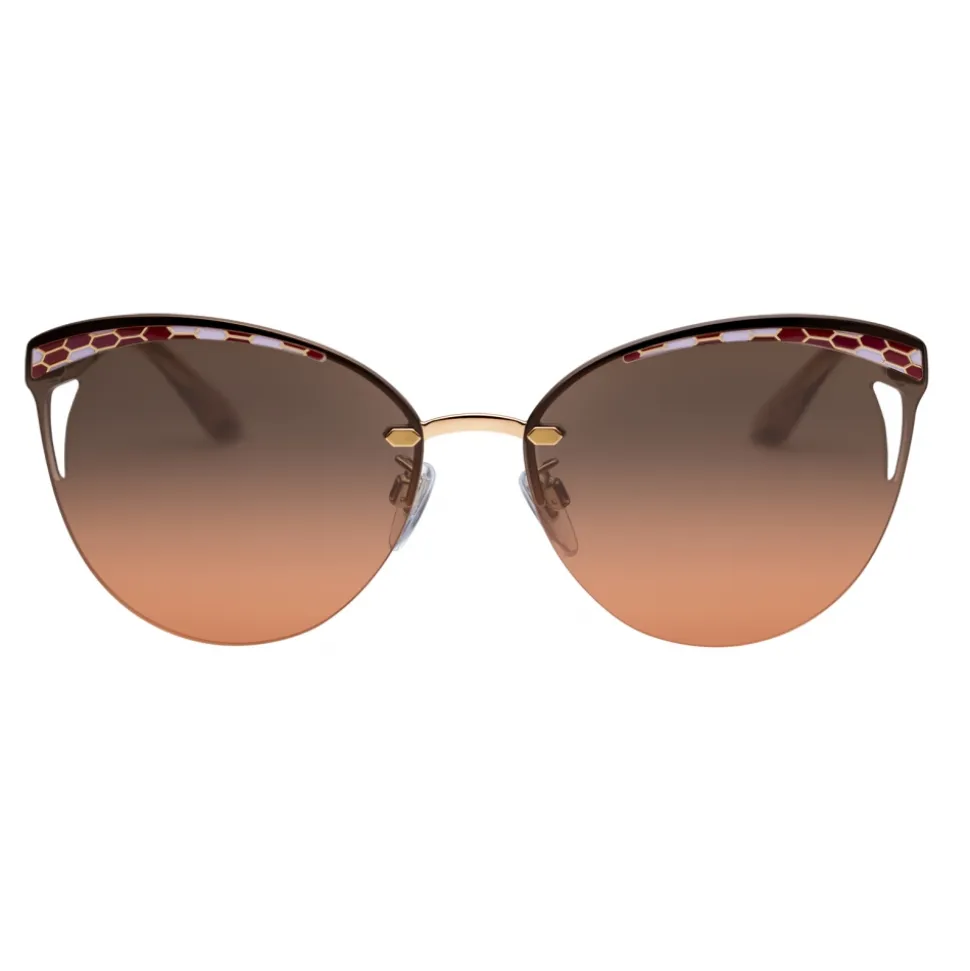 Bvlgari Serpentine “Rainbow Scales” semi-rimless cat-eye sunglasses with an enameled scale motif on the browline and openwork details. The distinctive sinuous temples add a feminine look.