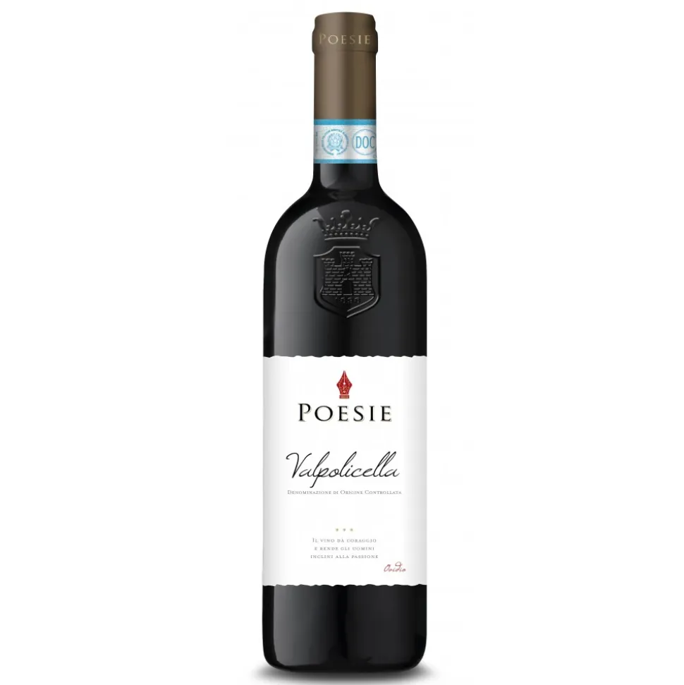 In the hilly area between Verona and Venice, where medieval fortresses stand among the lush vineyards, the Corvina, Rondinella and Molinara grapes grow that produce this Valpolicella. The wine is full-bodied, dry, and well rounded dry red wine, that perfectly complements red meat dishes and seasoned cheeses.