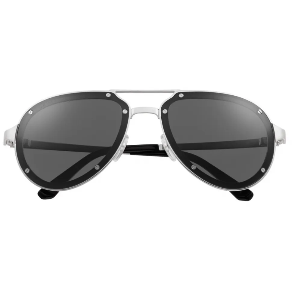 Santos de Cartier sunglasses in smooth and brushed platinum-finish metal, pilot shape and grey lenses.