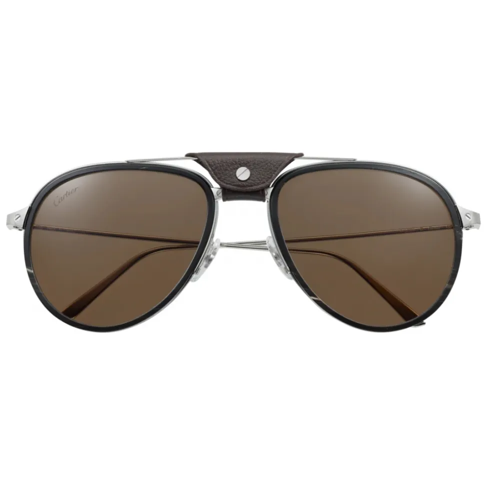 Santos de Cartier sunglasses, rimmed lenses in black horn and carbon, metal with a glossy platinum finish, brown leather bridge detail, pilot shape, brown polarized lenses, protection rating 3.
