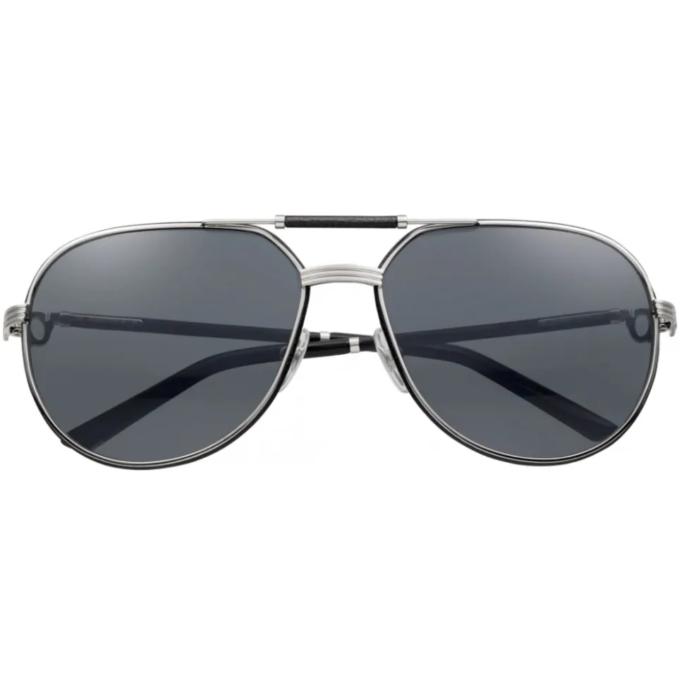 Sunglasses in black leather with a glossy platinum finish, pilot shape, gray polarized lenses, protection grade 3, Cartier signed terminals with platinum finish.