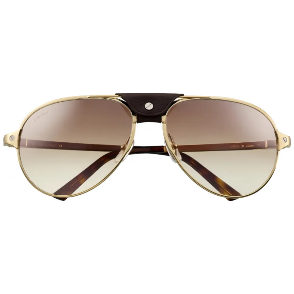 Santos de Cartier sunglasses in metal with brushed champagne gold finish, screws with polished ruthenium finish, pilot shape, brown leather bridge detail, shaded brown lenses, tortoise acetate terminals, Cartier signed temples.