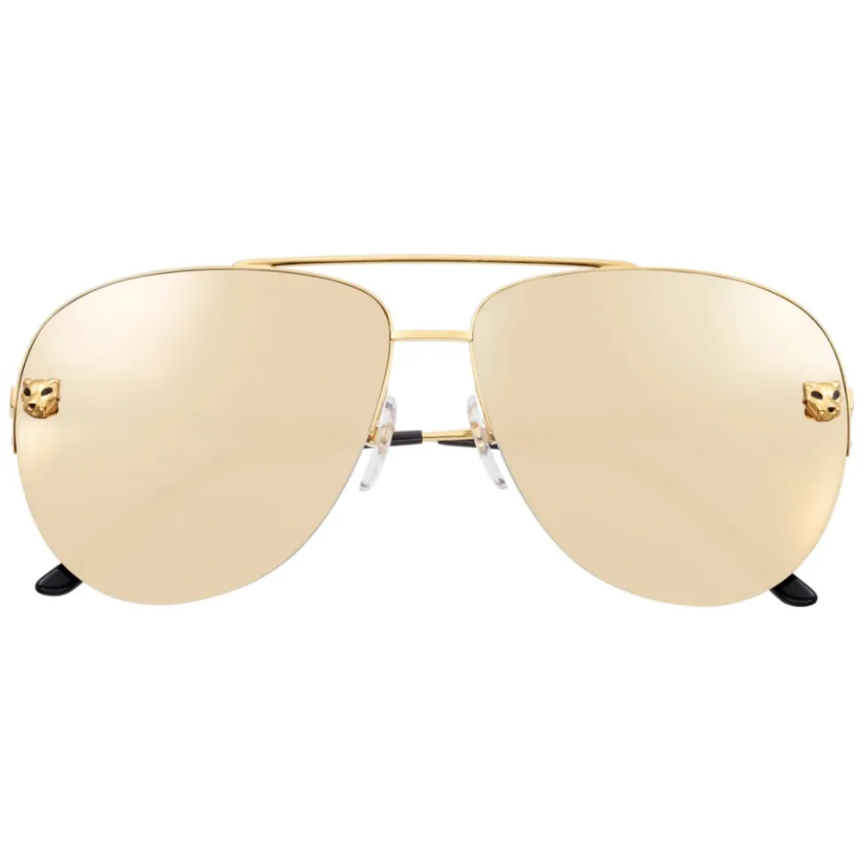 Metal sunglasses with shiny gold finish, pilot shape, double bridge, golden mirror-effect lenses, panther heads with gold finish and black lacquer spots, black acetate terminals, Cartier signed temples.