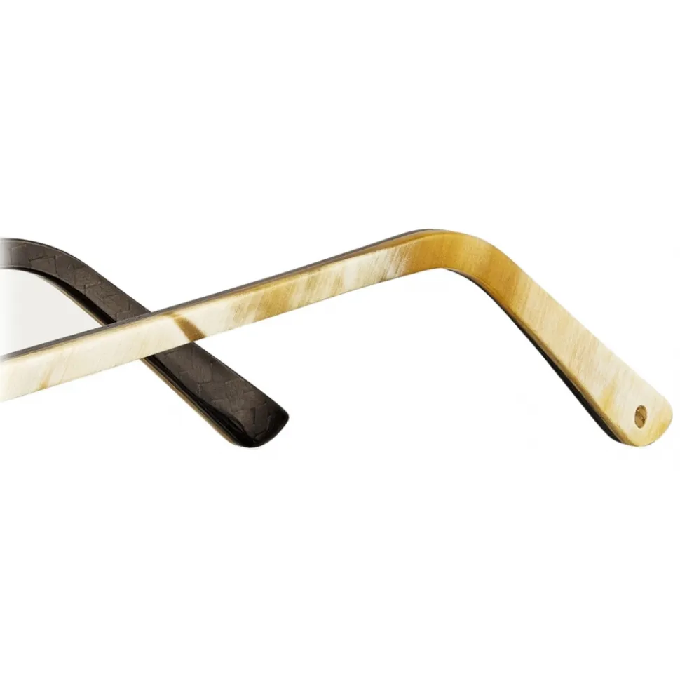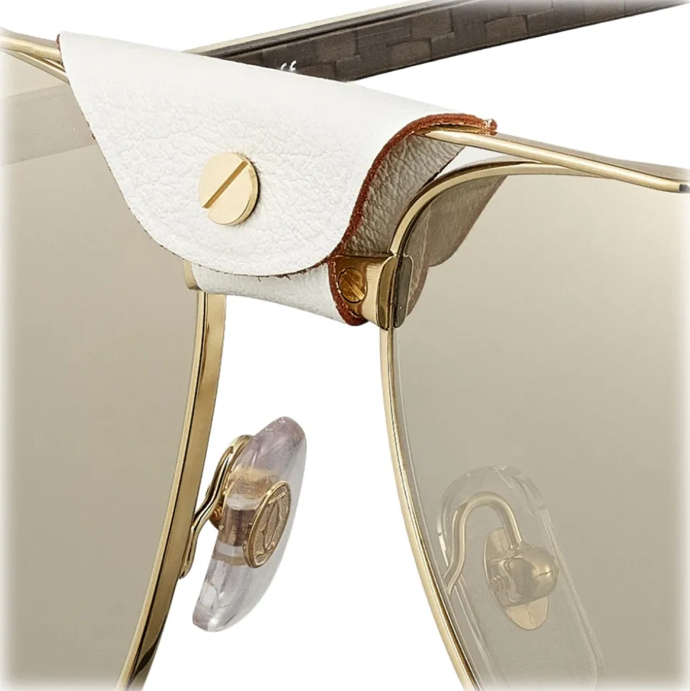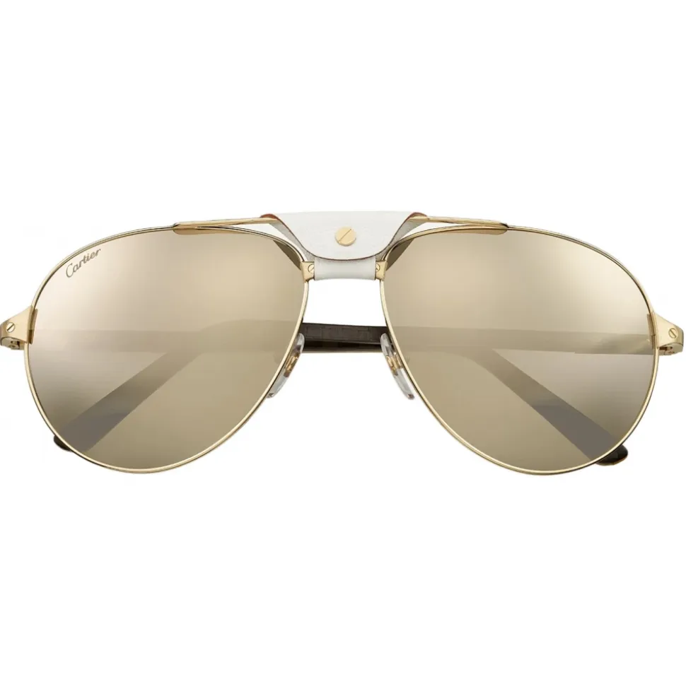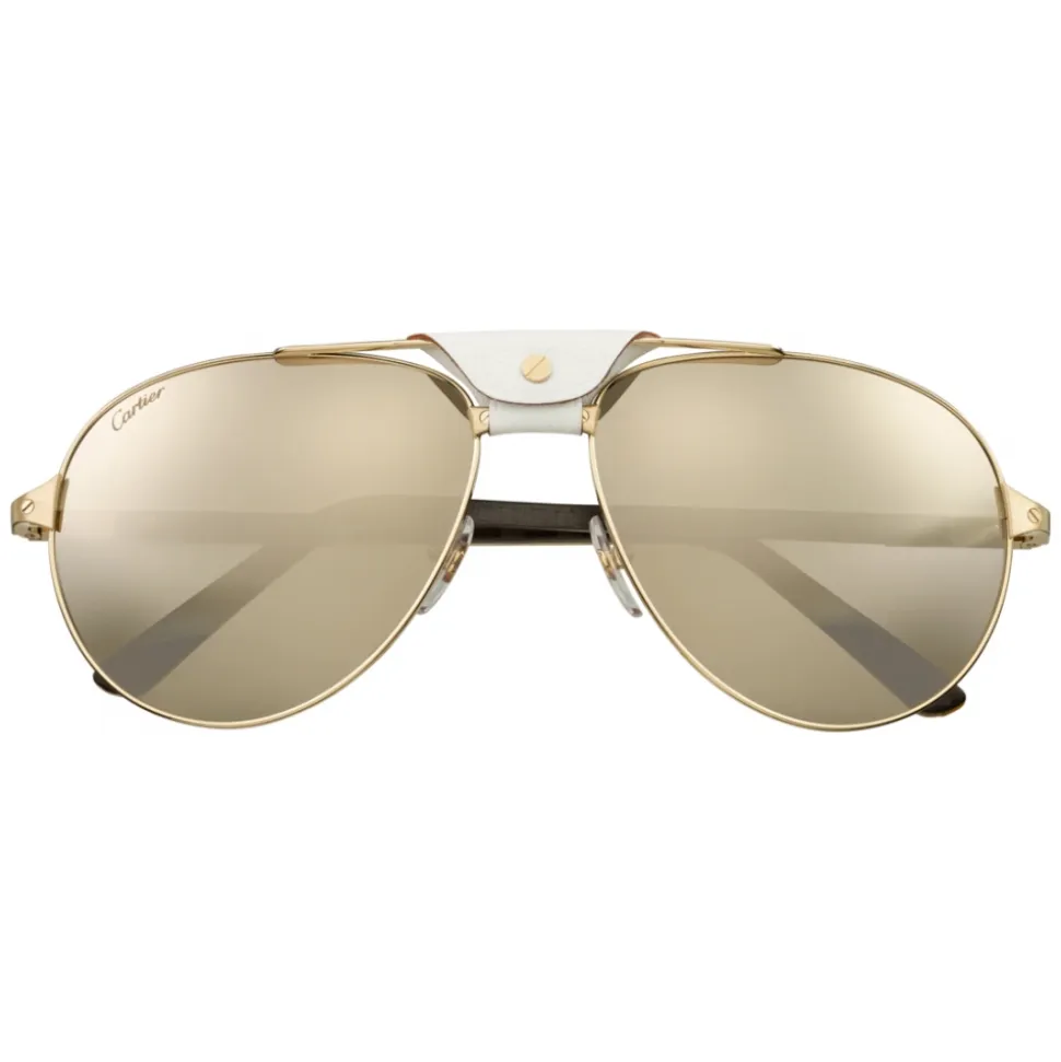 Santos de Cartier sunglasses, white horn and carbon temples, polished champagne gold finish metal, white leather bridge detail, pilot shape, lenses with gold flash, degree of protection 3.