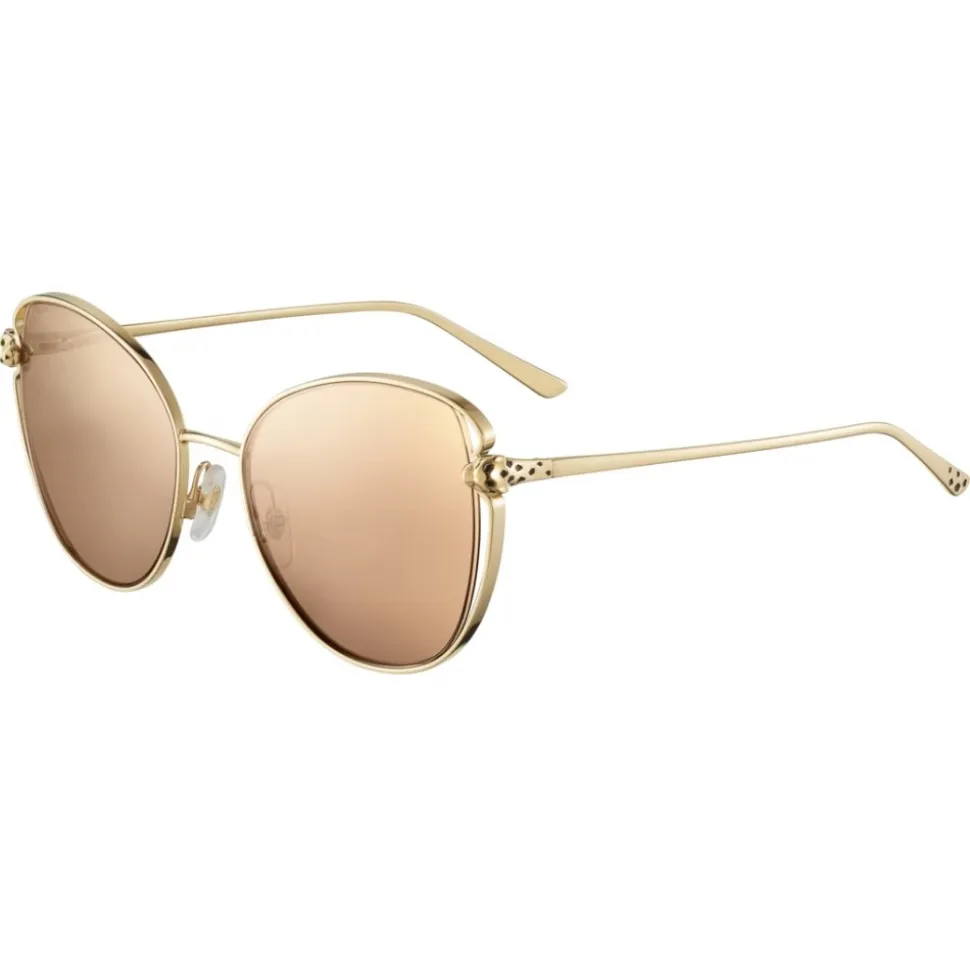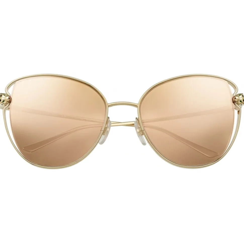 Panthère de Cartier sunglasses in smooth golden-finish metal, golden-finish panther heads with black lacquer spots and green lacquer eyes, butterfly shape openwork and pink lenses with golden flash.