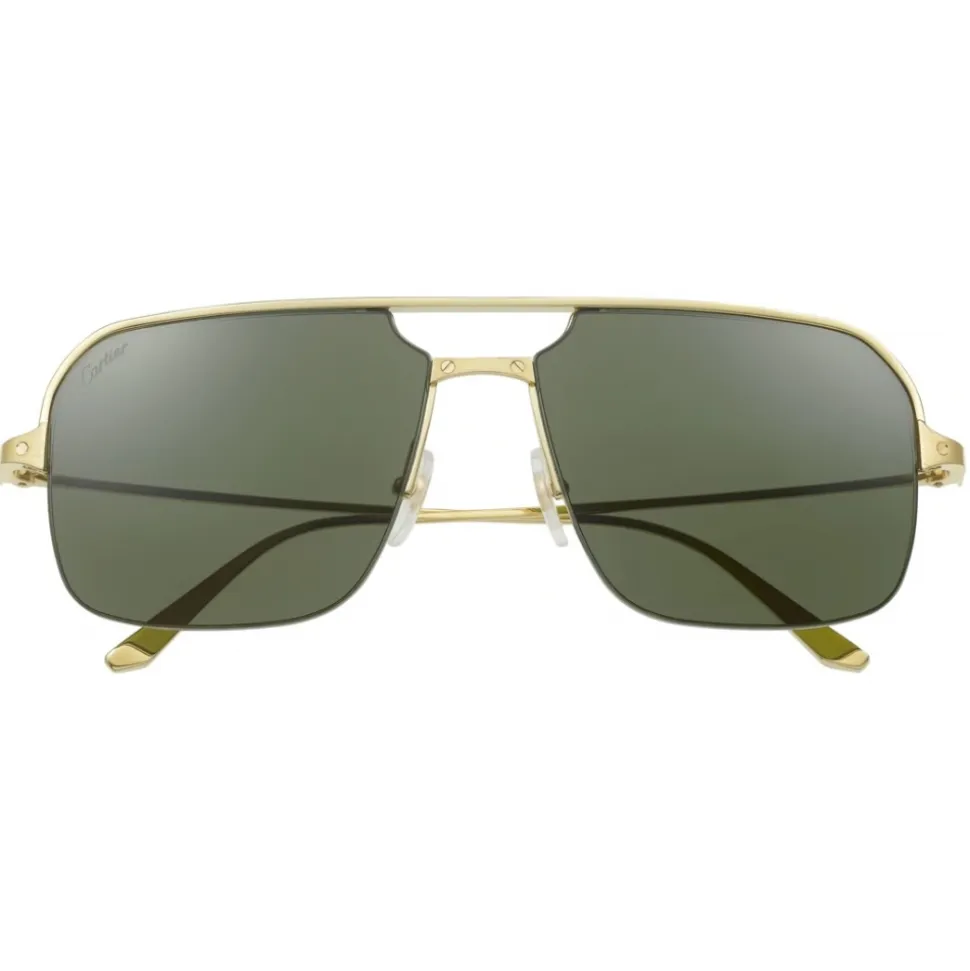 Santos de Cartier sunglasses in smooth and brushed golden-finish metal, golden-finish metal screws, caravan shape and green lenses.