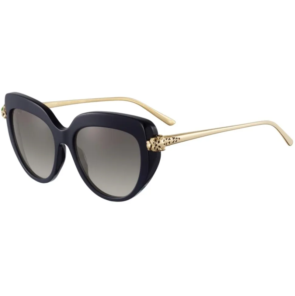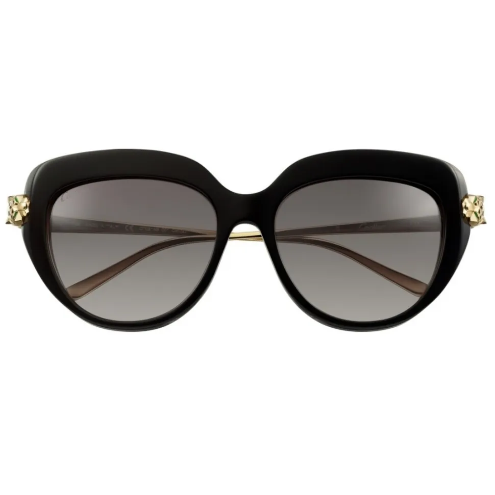 Panthère de Cartier sunglasses in black composite, smooth golden-finish metal, golden-finish panther heads and black lacquer spots, cat eye shape and graduated gray lenses.