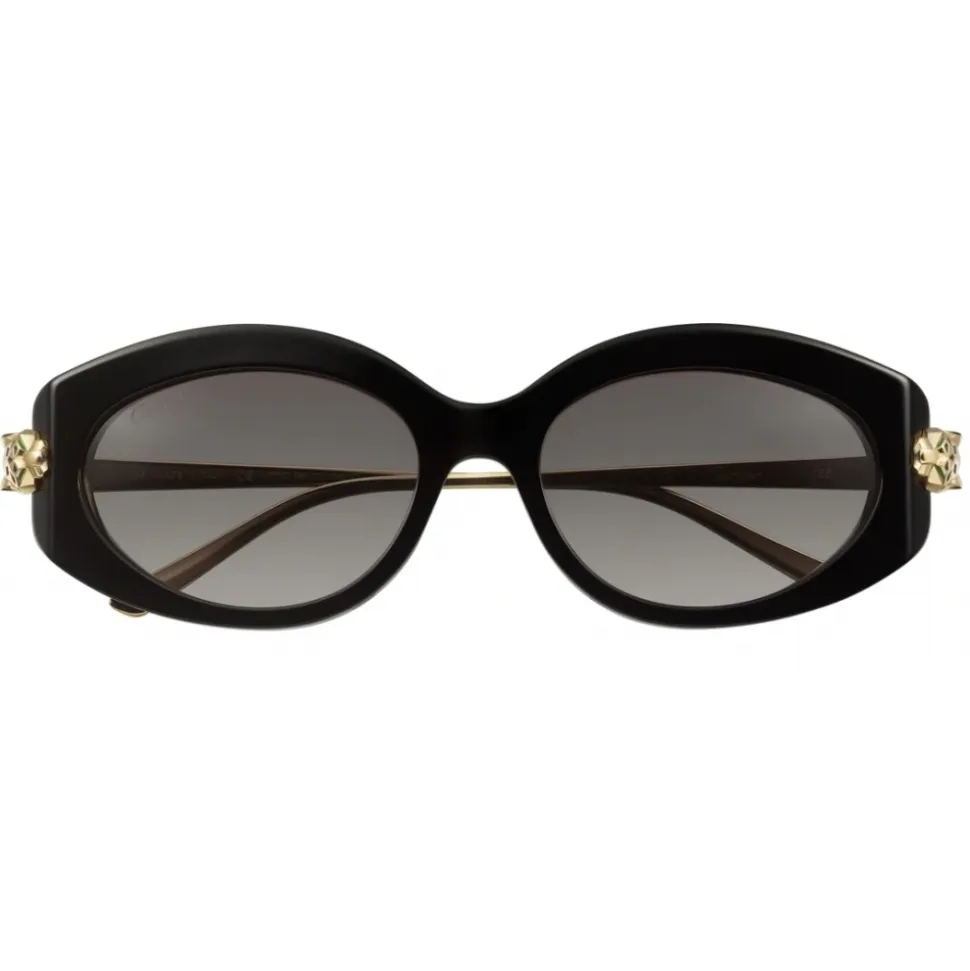 Panthère de Cartier sunglasses in black composite, smooth golden-finish metal, golden-finish panther heads and black lacquer spots, cat eye shape and graduated gray lenses.
