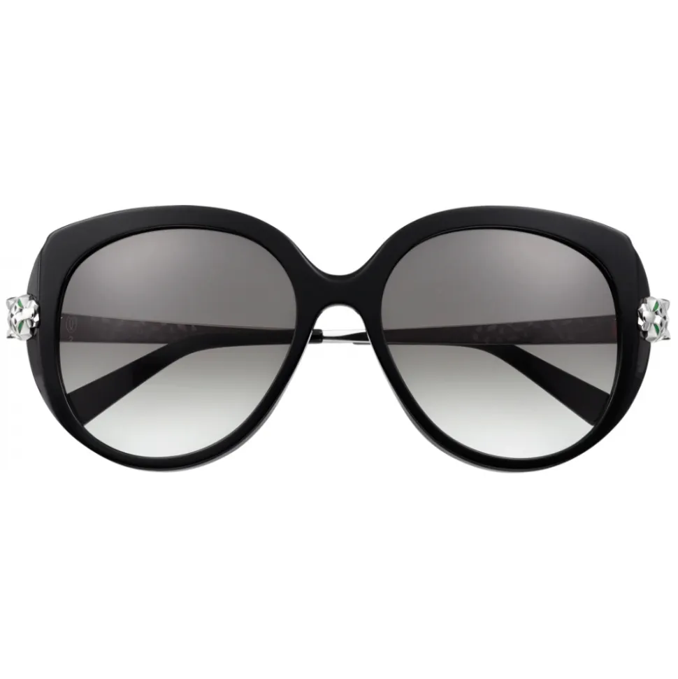 Sunglasses in black acetate and metal with a glossy platinum finish, spotted panther head decoration in black lacquer, cat’s eye shape, shaded gray lenses, protection grade 2, Cartier signature temples, black terminals.