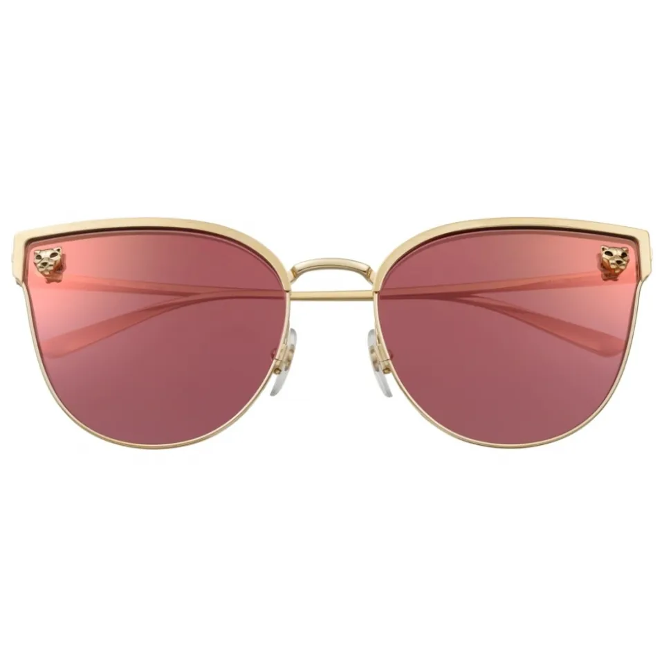 Panthère de Cartier sunglasses in smooth golden-finish and brushed golden-finish metal, golden-finish panther heads and black lacquer spots, cat eye shape and pink lenses with pink flash.