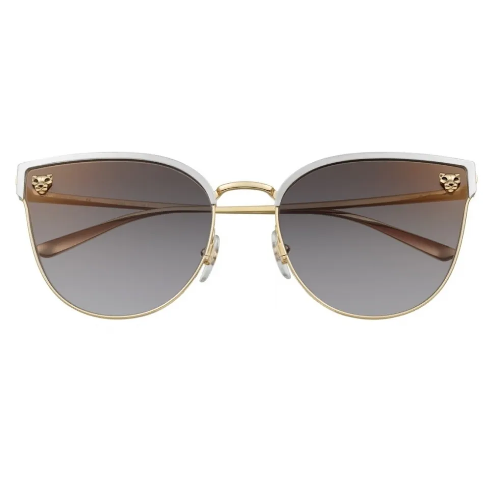 Panthère de Cartier sunglasses in shiny gold and brushed platinum finish metal, panther heads with gold finish and black lacquer spots, cat’s eye shape and gray lenses with gold flash.