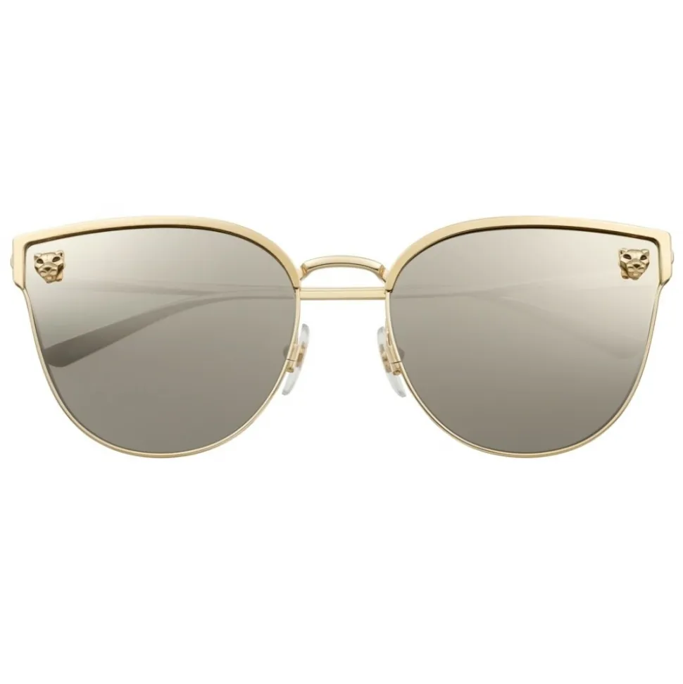 Panthère de Cartier sunglasses in smooth and brushed golden-finish metal, golden-finish panther heads and black lacquer spots, cat eye shape and grey lenses with ivory-colour mirror finish.