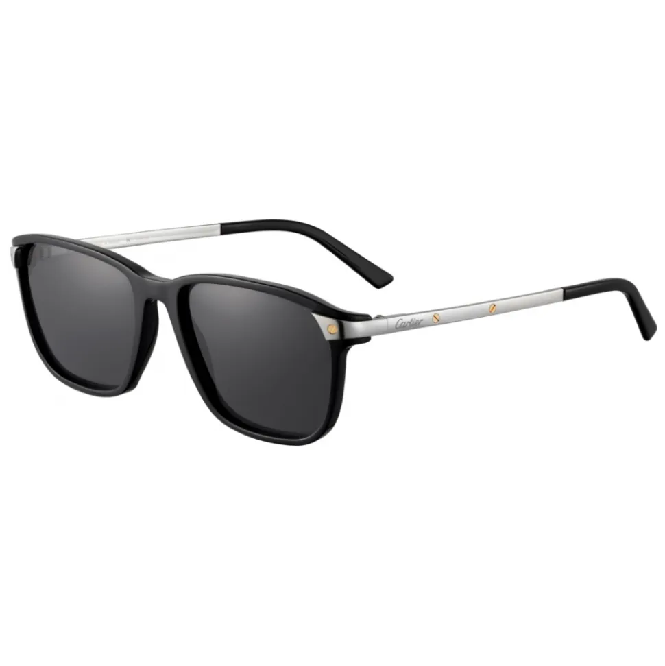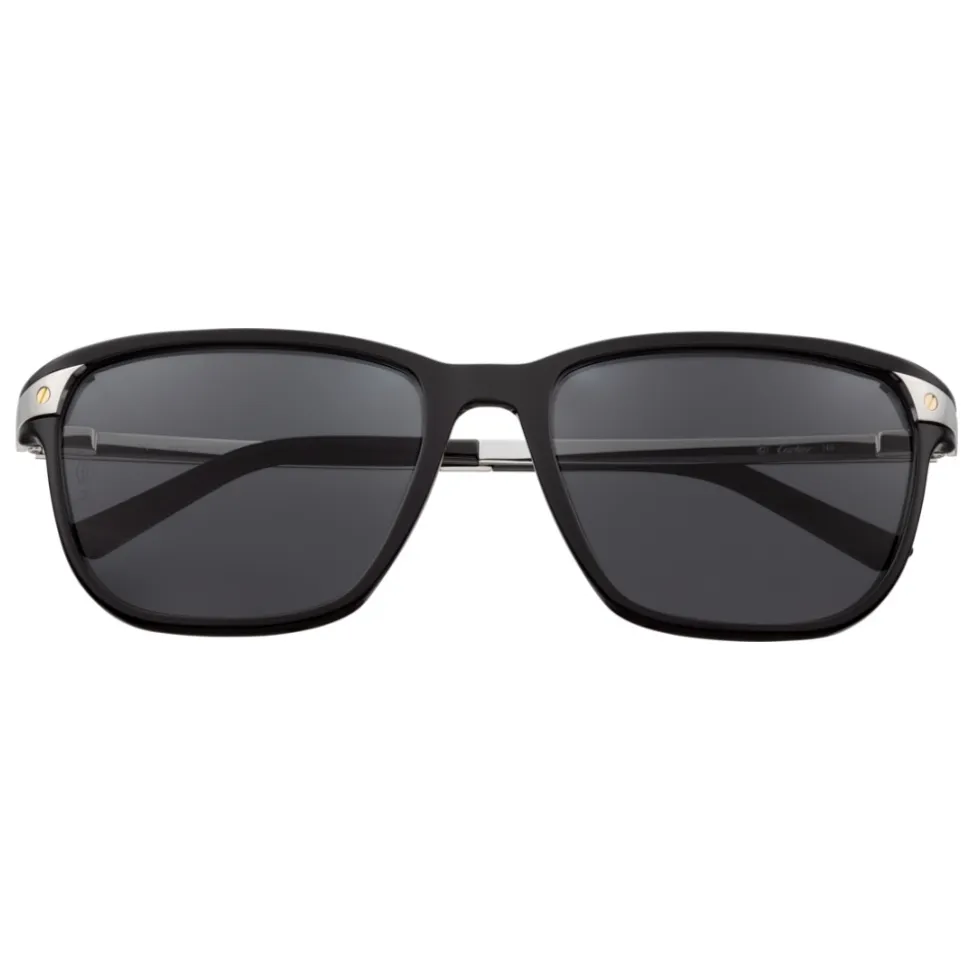 Black acetate sunglasses with brushed platinum finish and screws with a shiny gold finish, large rectangular shape, gray polarized lenses, black terminals, Cartier signed temples.