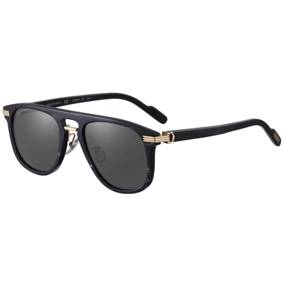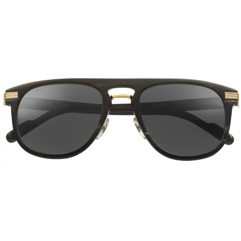 Première de Cartier sunglasses in black horn, metal with gold and platinum finish, rectangular shape and gray lenses.