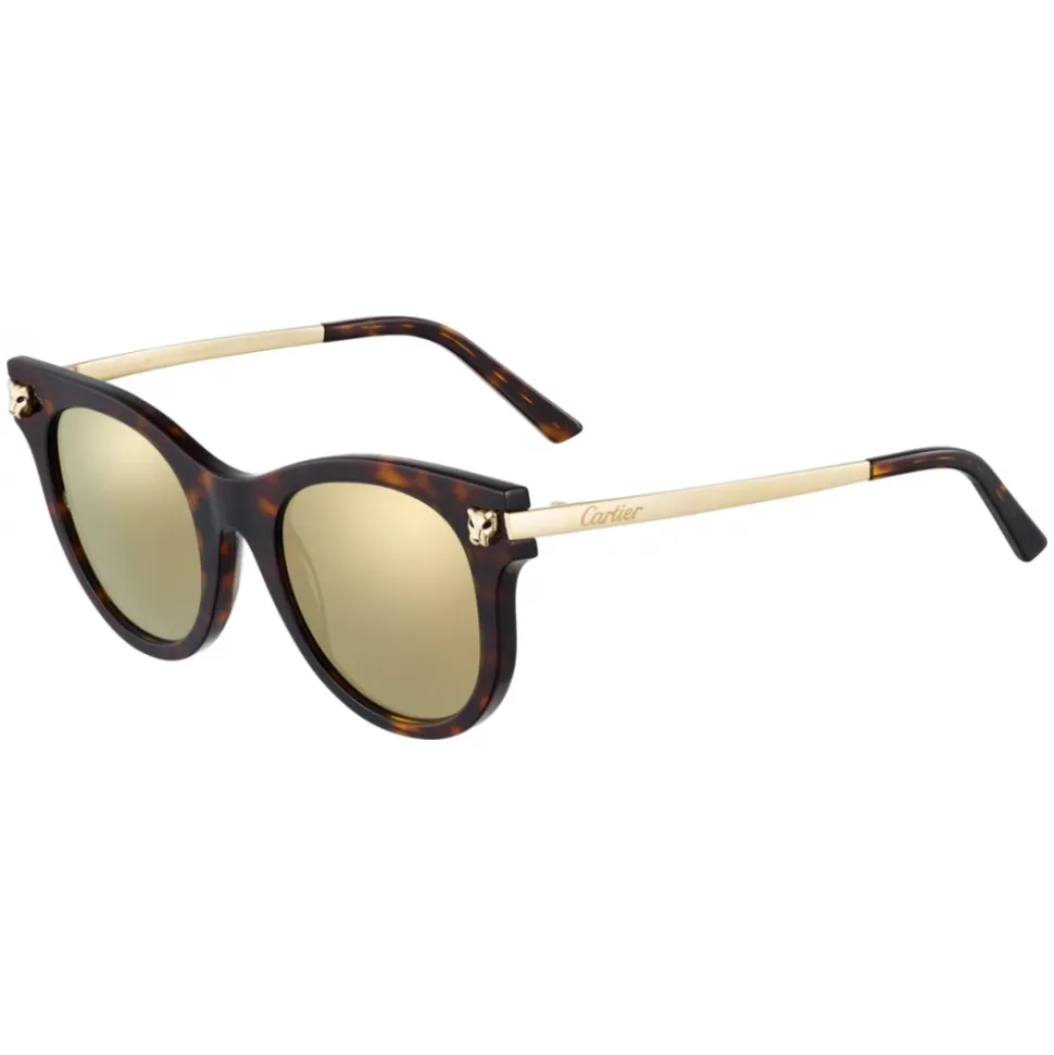 Panthère de Cartier sunglasses in tortoiseshell acetate, metal with polished champagne gold finish, panther heads with champagne gold finish and black lacquer spots, cat’s eye shape, dark gray lenses, protection grade 3, Cartier signed temples, terminals blacks.