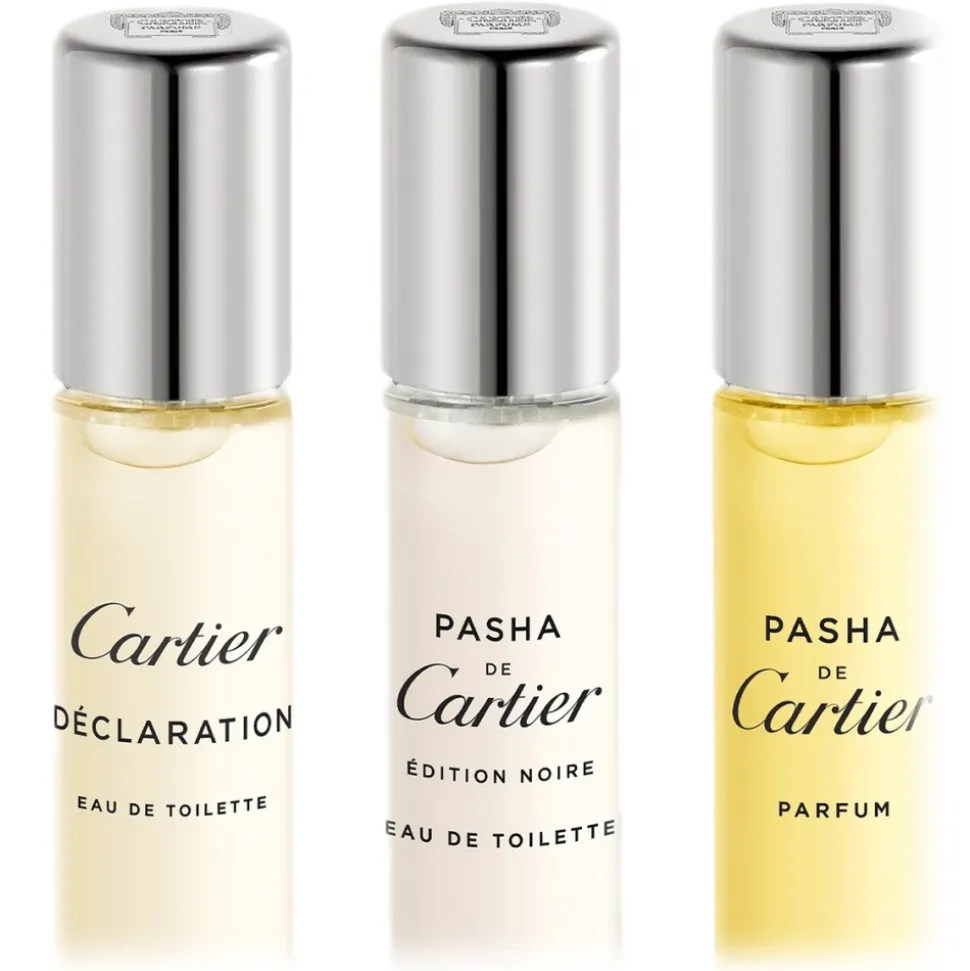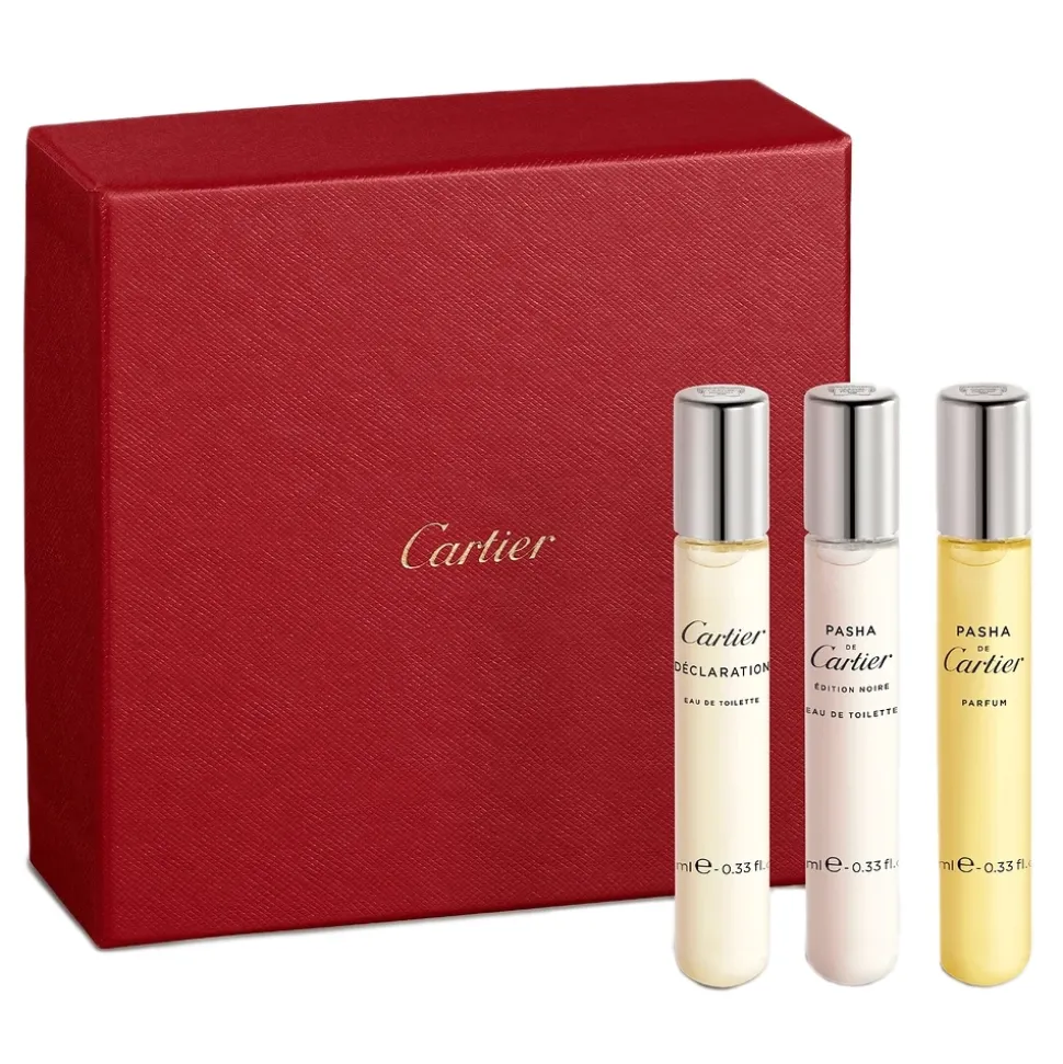 The Maison Cartier is delighted to present three of its finest olfactory creations for men, with an elegant set composed of three 10 ml sprays: Déclaration Eau de Toilette, Pasha Edition Noire Eau de Toilette and Pasha Fragrance.