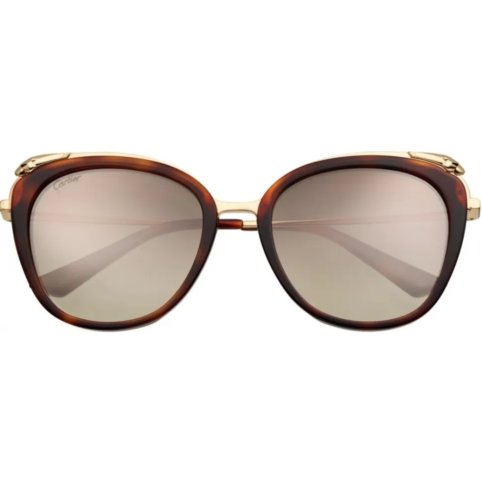 Panthère de Cartier sunglasses in combined tortoiseshell composite and smooth champagne golden-finish metal, champagne golden-finish panther, oval shape, graduated brown lenses, class 2 solar protection.