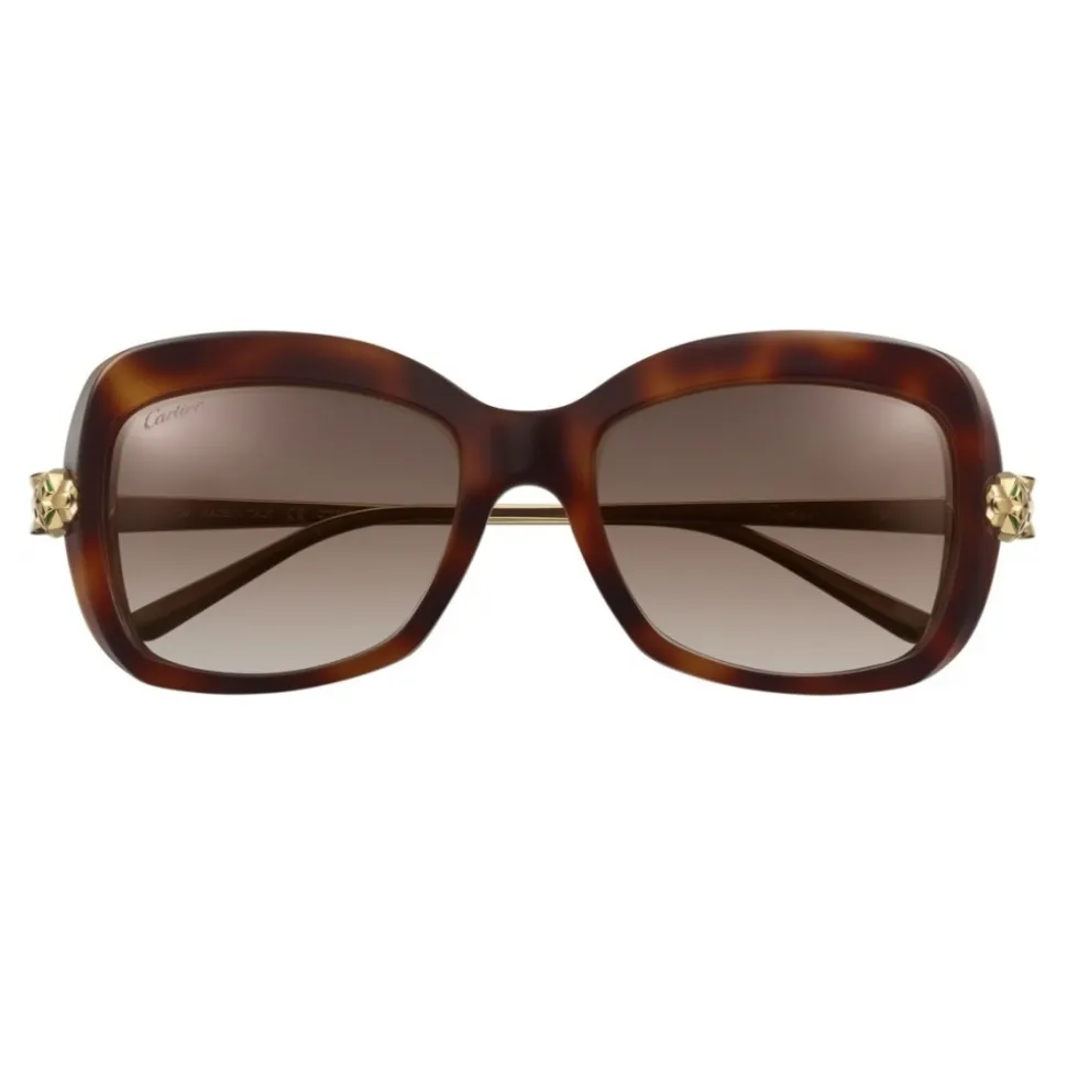 Panthère de Cartier sunglasses in tortoiseshell composite, smooth golden-finish metal, golden-finish panther heads and black lacquer spots, rectangular shape and graduated brown lenses.