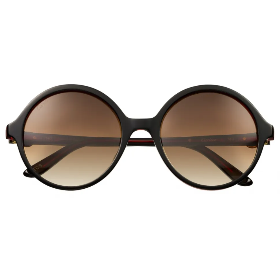 Signature C de Cartier sunglasses in two-tone black and red composite, smooth champagne golden finish, round shape, graded brown lenses, class 2 solar protection.