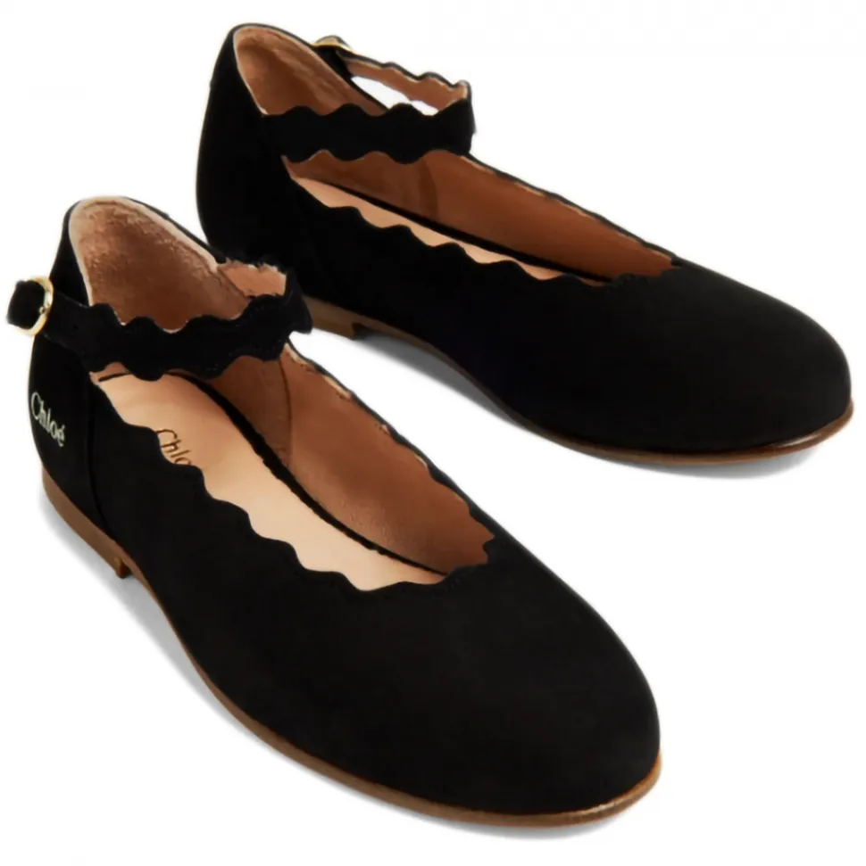 Chloé Kids Ballet Shoes Black. Calf leather, suede, scallop edge, round toe. Buckle fastening, engraved log, branded inner sole, flat rubber sole.
