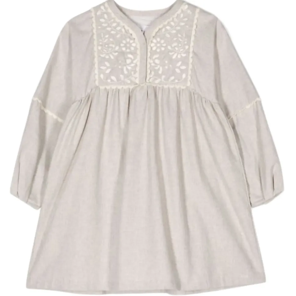 Chloè Kids Dress Chine Beige. Gathered detail, embroidered design, V-neck. Concealed front fastening, long sleeves, fitted cuffs and flared hem.