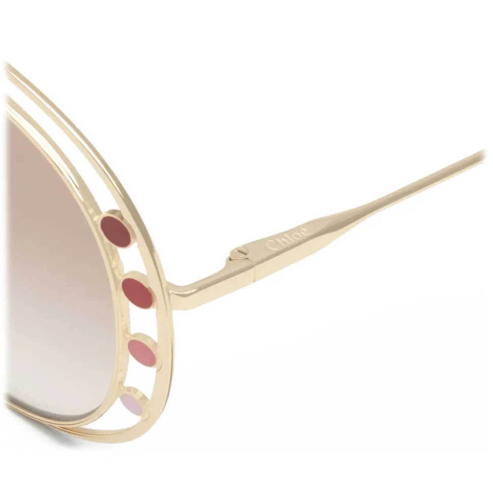 The light gold metal frame sports glazed decorations that create a lively rainbow effect, highlighting the shaded brown lenses. The temple terminals of these women’s sunglasses feature the Maison’s iconic drop-shaped opening, compatible with eyewear jewelry.