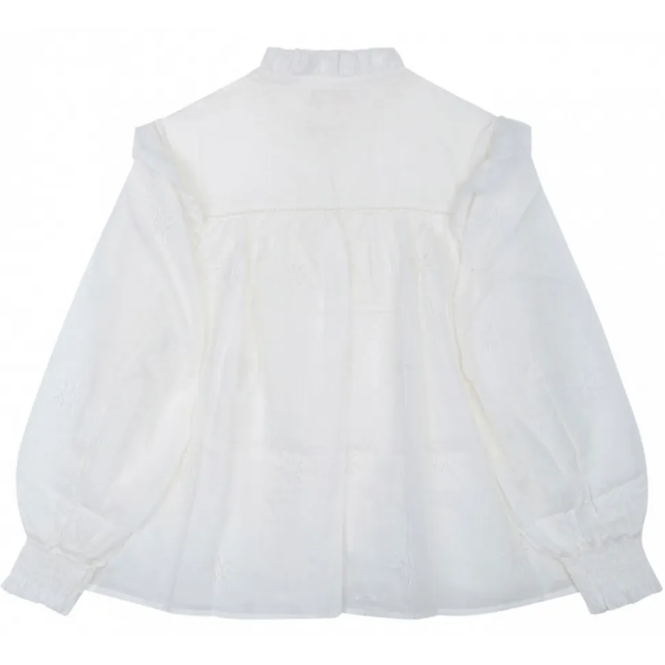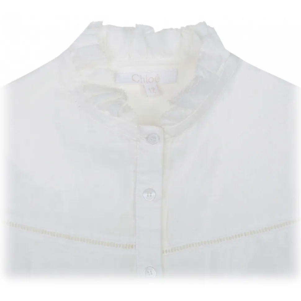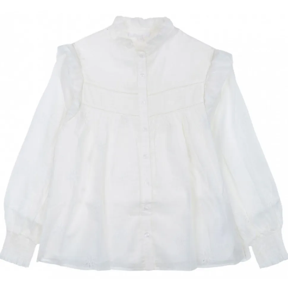 Chloé Embroidered Stars Off-White Shirt with long sleeves. Ruffles on collar and armholes, embroidered logo on bottom hem, smock stitch cuffs and center front button closure.