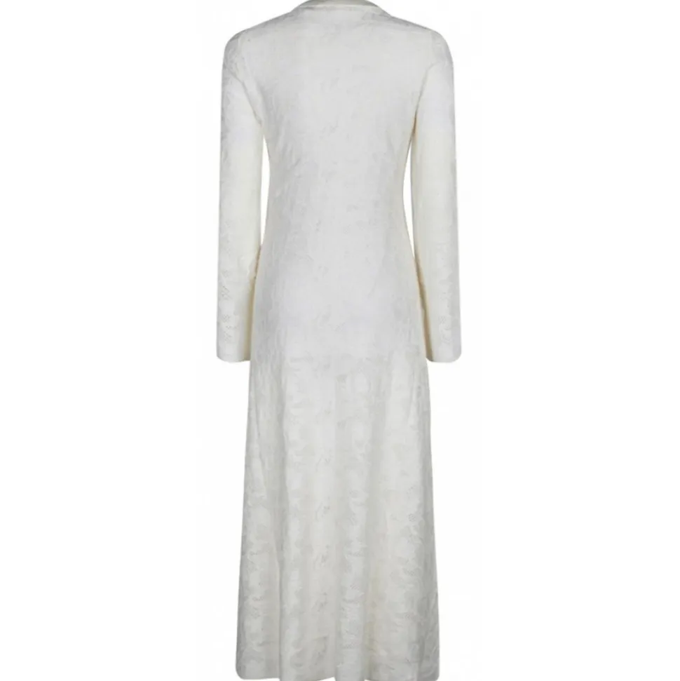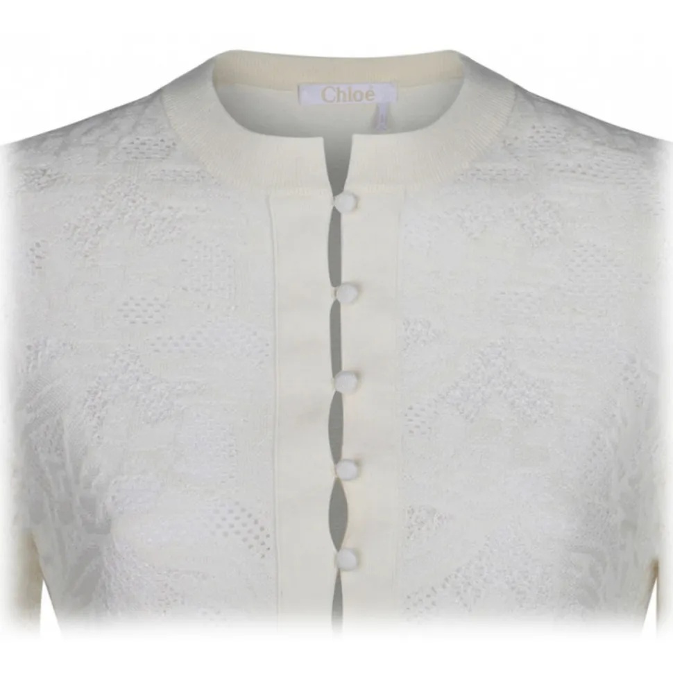 Chloé Iconic Milk Midi Dress in silk and wool blend with perforated effect. Ribbed crew neck and bell sleeves. Front button placket. Flared hem and long sleeves.
