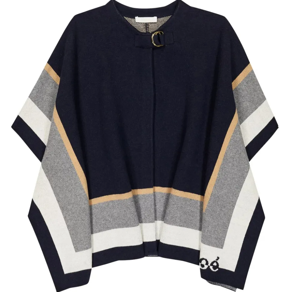 Chloé Kids Striped Knitted cape Navy Blue. Logo print on the front, round neck, buckle fastening, straight hem.