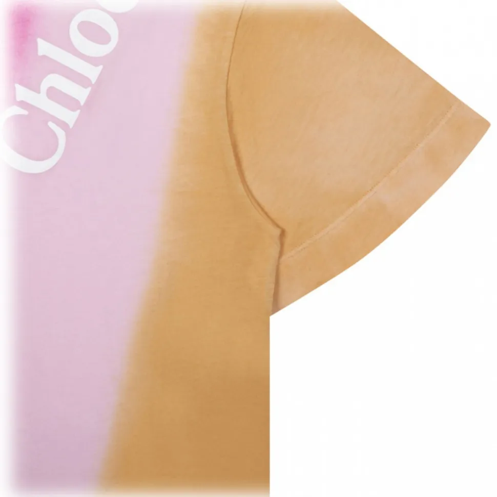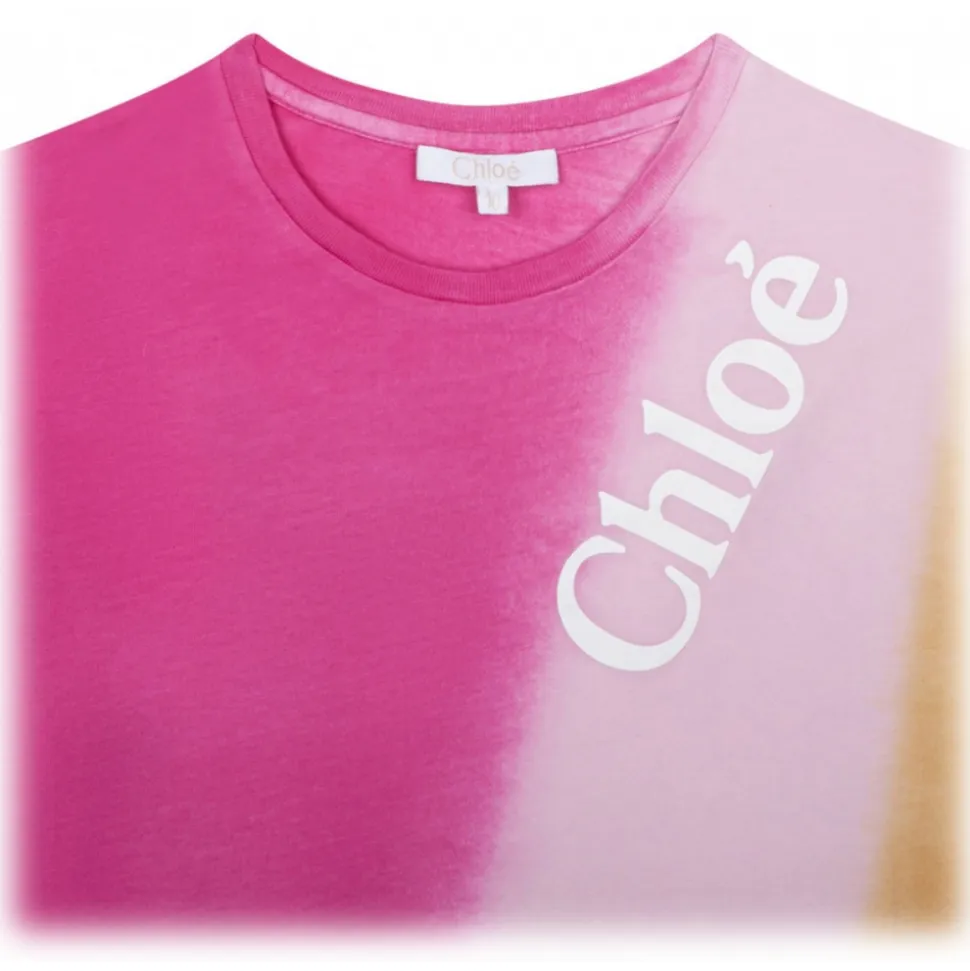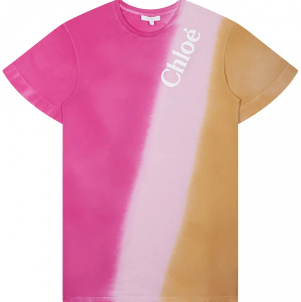 Chloé Kids Multicolour Dress. Multicolour organic cotton dress, gradient effect, tie dye print. Logo print to the front, round neck, short sleeves, straight hem.
