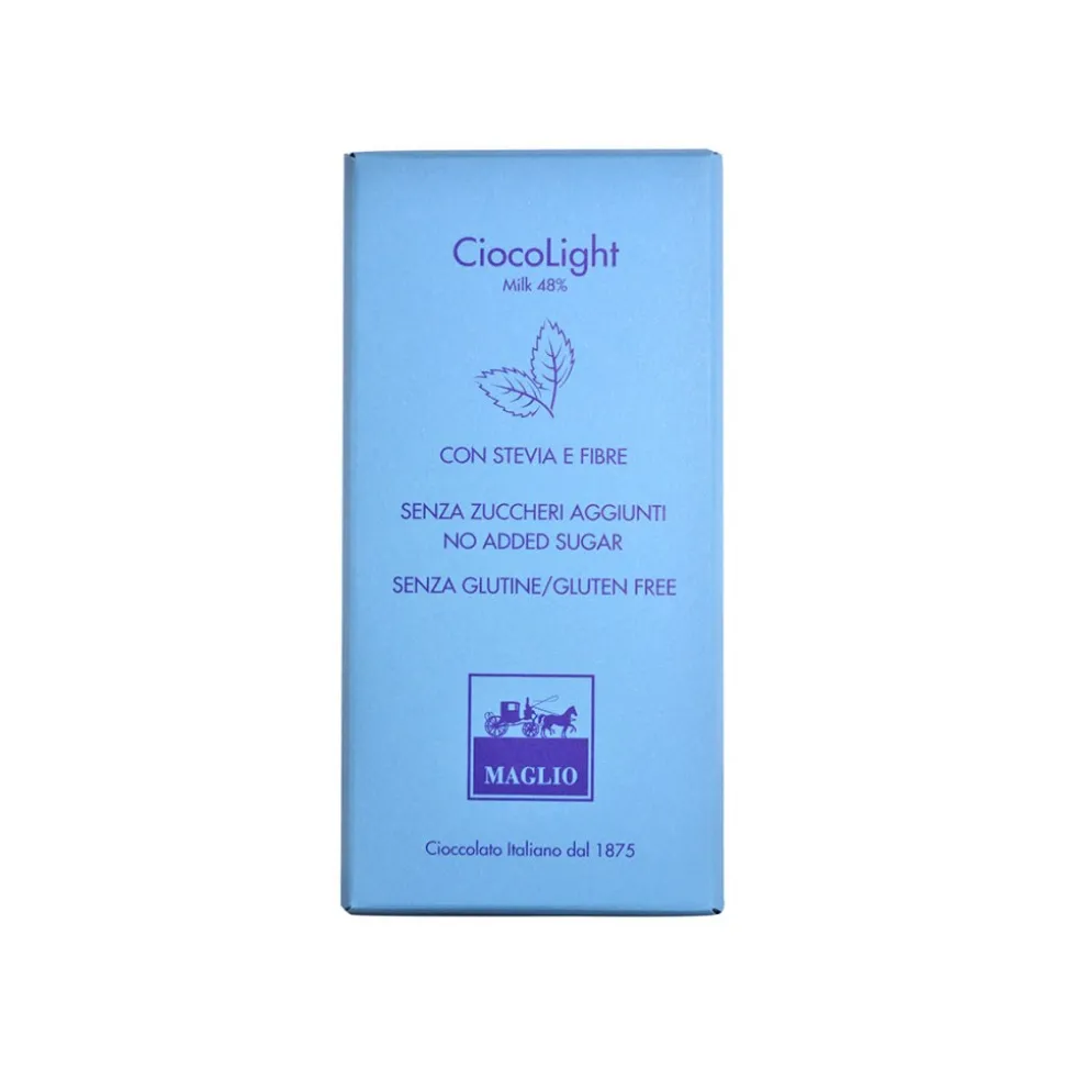 Milk Chocolight: Cocoa butter, whole milk powder, dietary fiber 21% (dextrin, Inulin, Oligofructose), sweetener: maltitol, cocoa mass, emulsifier: soy lecithin, sweetener: steviol glycosides 1%, natural flavors: vanilla. Cocoa minimum 48%. Excessive consumption may produce laxative effects. May contain traces of nuts and almonds and milk proteins.