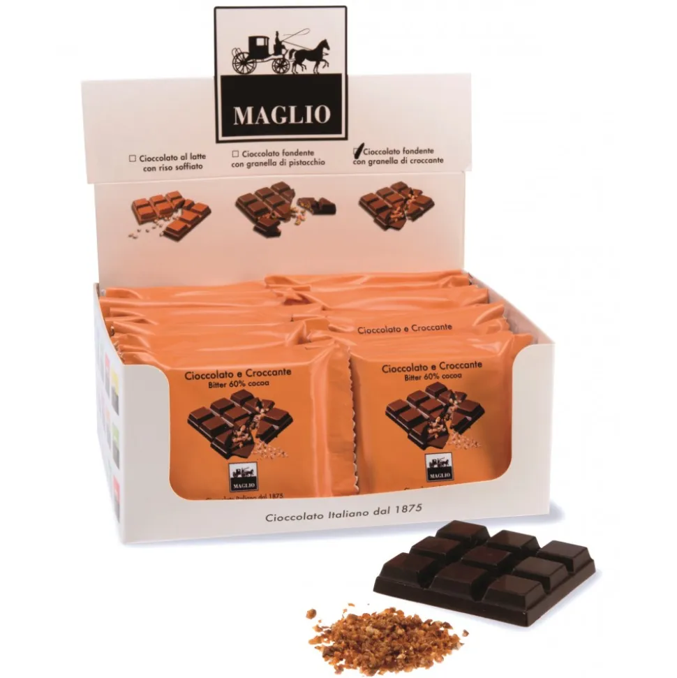 Dark chocolate bar filled with pieces of nut brittle is a different way to taste Maglio.