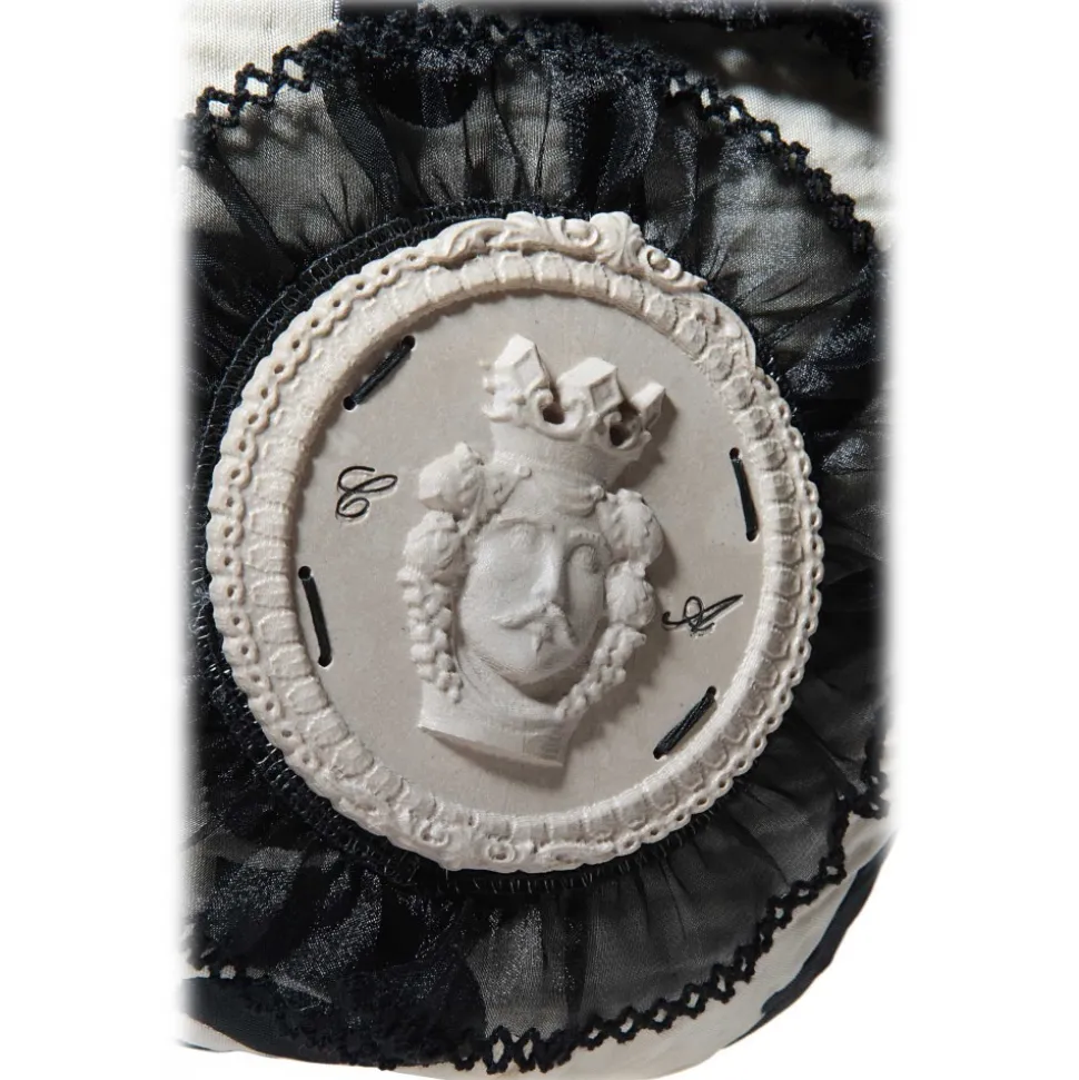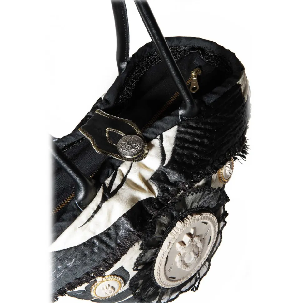 Covering patterned brocade fabric with ruffle at the edge hand-finished; Black leather handles and charms with stone died, zipper closure; central dark baroque frame engraved on stone, lateral black tassels valuable material