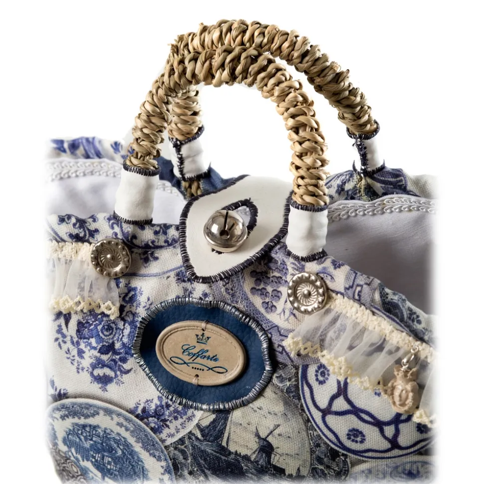 Upholstery in blue and beige cotton with the image of collector’s plates, trimmings with interweaving and organza lace with light shades and dark brown stone pendants, handle with inserts in beige eco-leather, bell closure; trademark in Comiso stone with the word “COFFARTE”. Coffa Baby Royal Copenhagen shows its creativity from the love that women have for typical Danish collector’s dishes.