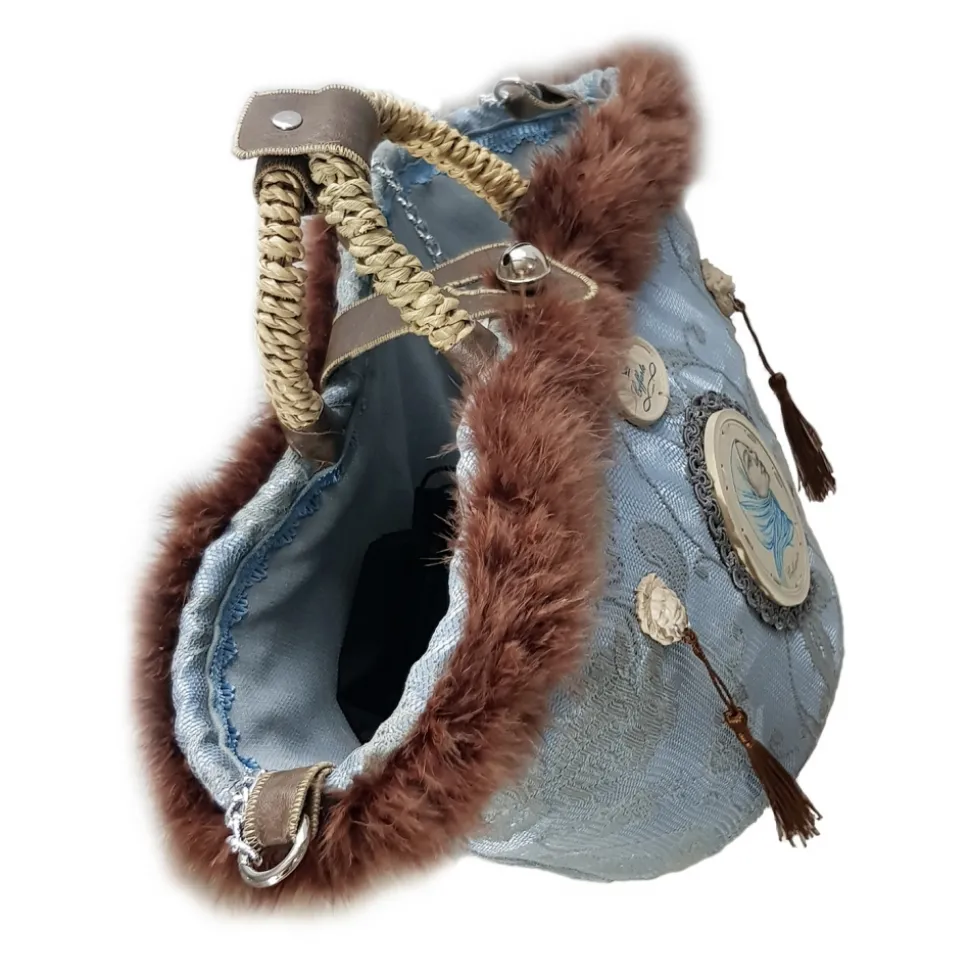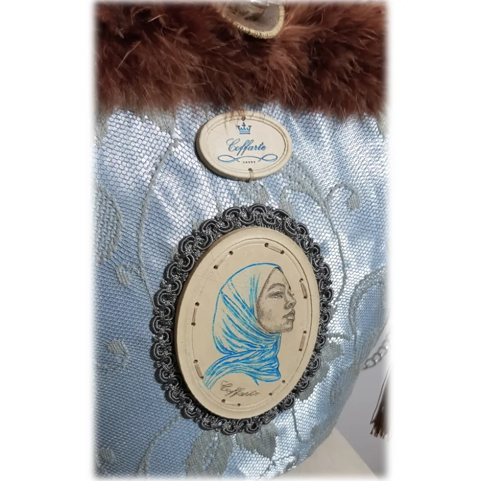 Covering in gray lace with light blue silk satin below, passementerie with brown feathers, central and front stone inserts, depicting the head of lions with hanging tassels afterwards, bell closure and handles with eco-leather inserts; central stone insert depicting an oriental woman, central stone brand with the word “COFFARTE” and finally, a small mirror in the back. The Coffa Aisha in gray lace is inspired by the oriental woman, capable of facing any challenge; it can be adapted at any time of the day.